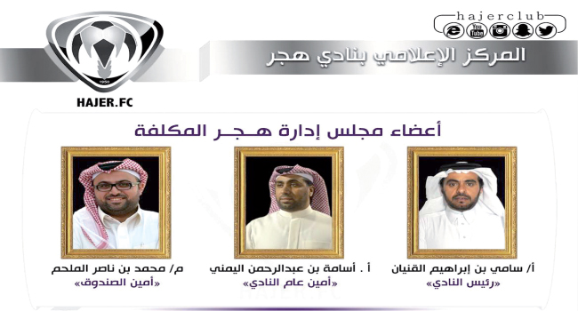 أصدرت الهيئة العامة للرياضة قرارا بتكليف إدارة مؤقتة لإدارة نادي هجر وذلك لمدة ثلاثة أشهر ، وذلك برئاسة سامي بن ابراهيم القنيان ، وعضوية أسامة بن عبدالرحمن اليمني (امين عام النادي المكلف) ، والمهندس محمد بن ناصر الملحم (أمين الصندوق المكلف) .هذا وسيتم الإعلان لاحقاً عن تاريخ بدأ فتح باب الترشيح لرئاسة النادي وموعد عقد الجمعية العمومية.