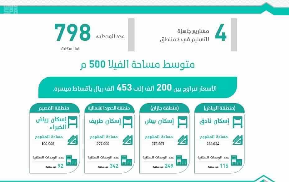 و91 فيلا سكنية في محافظة رياض الخبراء بمنطقة القصيم، و115 فيلا سكنية في محافظة ثادق بمنطقة الرياض.
