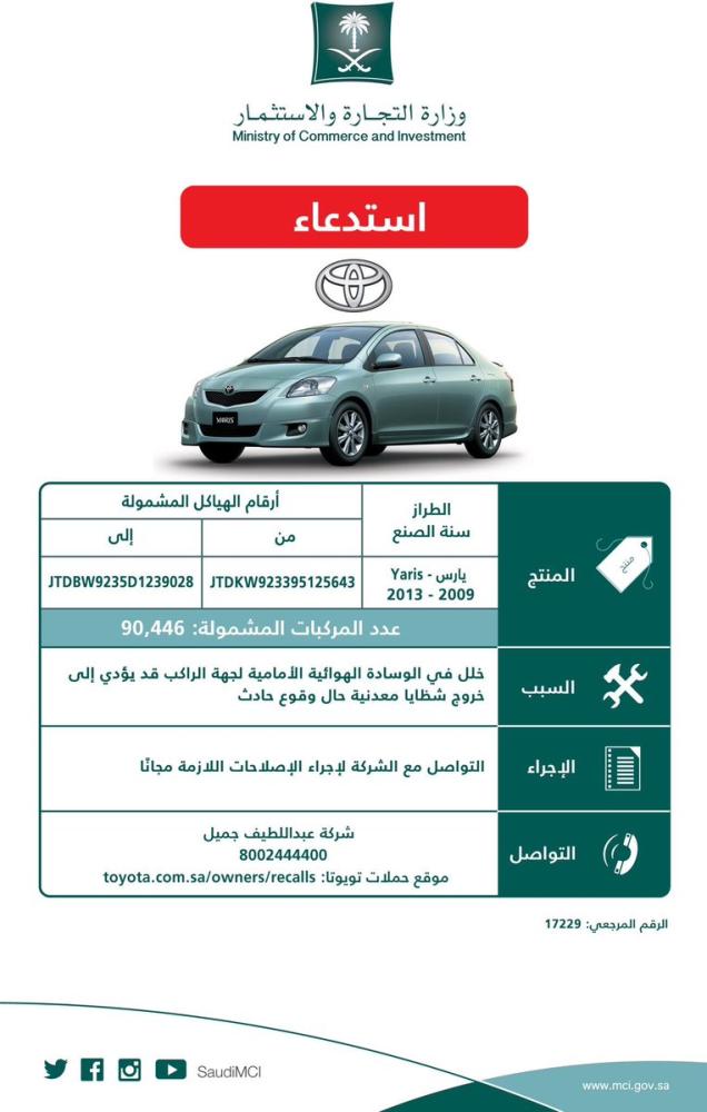 أعلنت وزارة التجارة والاستثمار ، اليوم الجمعة، استدعاء 166 ألف مركبة “تويوتا” “يارس 2009-2013″، و “كورولا 2008-2010”.