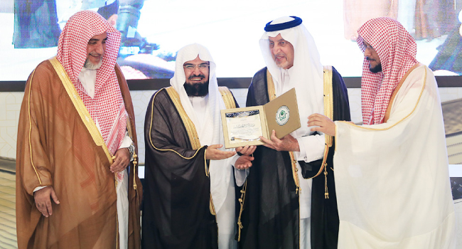 نيابة عن خادم الحرمين الشريفين الملك سلمان بن عبد العزيز آل سعود ، حفظه الله، رعى صاحب السمو الملكي الأمير خالد الفيصل بن عبد العزيز مستشار خادم الحرمين الشريفين أمير منطقة مكة المكرمة بالمسجد الحرام مساء أمس حفل ختام وتكريم الفائزين بجوائز مسابقة الملك عبد العزيز الدولية لحفظ القرآن الكريم التي نظمتها الأمانة العامة للمسابقة المحلية والدولية بوزارة الشؤون الإسلامية.