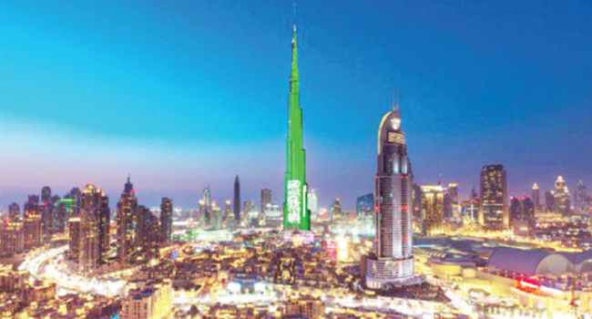 اكتسى برج خليفة بدبي باللون الأخضر، واسهاما في الفعاليات التي شهدتها الإمارات للاحتفال باليوم الوطني للمملكة.ونشر موقع “جلف نيوز” صورة لبرج خليفة البالغ ارتفاعه 828 مترا والذي يبلغ عدد طوابقه أكثر من 200 طابق وهو مضاء باللون الأخضر الذي يميز العلم السعودي.يذكر أن نافورة دبي تشارك في هذه المناسبة من خلال شلالات مياه تتناغم مع اغاني وطنية سعودية وتجذب اعدادا كبيرة من اهالي دبي وزائريها.
