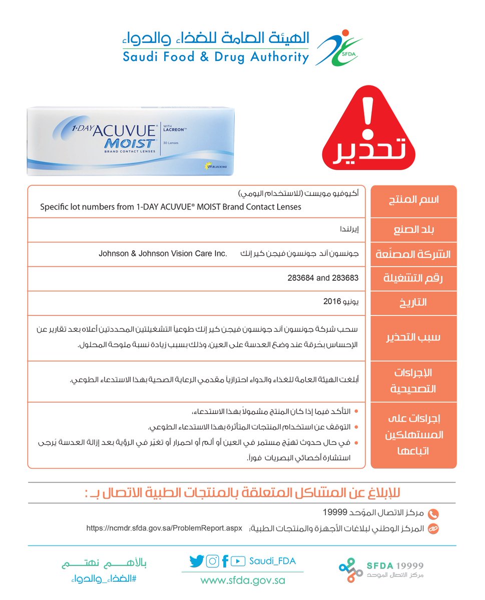 حذّرت الهيئة العامة للغذاء والدواء، اليوم الأربعاء ، من استخدام عدسات لاصقة للعلامة التجارية أكيوفيو مويست (للاستخدام اليومي) (Specific lot numbers from 1-DAY ACUVUE® MOIST Brand Contact Lenses) للتشغيلتين رقم (283683) و(283684) المصنّعتين في شهر يونيو 2016، وينتجها مصنع جونسون آند جونسون فيجن كير إنك (Johnson & Johnson Vision Care Inc) في إيرلندا.