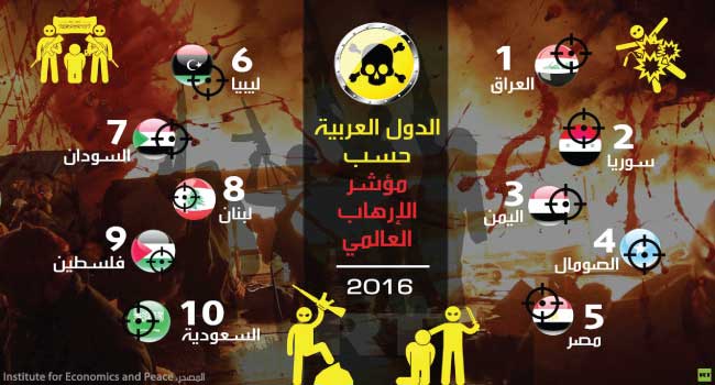 أظهر مؤشر الإرهاب العالمي الصادر عن معهد الاقتصاديات والسلام الأسترالي للأبحاث” ، امس الأربعاء، تراجعا في عدد القتلى جراء الهجمات الإرهابية خلال عام 2016 مقابل ارتفاع عدد البلدان التي يطالها الإرهاب.