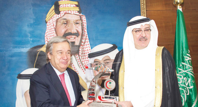 استقبل صاحب السمو الملكي الأمير فيصل بن عبدالله بن عبدالعزيز رئيس هيئة الهلال الأحمر السعودي ، في مكتب سموه بالرياض المفوض السامي للأمم المتحدة لشؤون اللاجئين انطونيو غوتيرس والوفد المرافق له.وجرى خلال الاستقبال بحث مجالات التعاون المشتركة بين الجانبين .وقد أثنى المفوض السامي للأمم المتحدة على ما تقدمه المملكة بتوجيهات خادم الحرمين الشريفين الملك عبدالله بن عبدالعزيز آل سعود – حفظه الله – من مساعدات إغاثية وإنسانية للاجئين في مختلف دول العالم ، التي كان لها أبلغ الأثر الملموس بمساعدة اللاجئين وتخفيف معاناتهم وتلبية احتياجاتهم في ضوء ما يمرون به من ظروف حياتية صعبة.