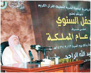 رعى سماحة الشيخ عبدالعزيز بن عبدالله آل الشيخ المفتي العام رئيس هيئة كبار العلماء و إدارة البحوث العلمية والإفتاء حفل تكريم المتميزين في الأنشطة بحلقات التحفيظ بمساجد مركز الغرب التابعة للجمعية الخيرية لتحفيظ القرآن الكريم في منطقة الرياض بحضور الشيخ سعد بن محمد آل فريان رئيس الجمعية الخيرية لتحفيظ القرآن الكريم مساء السبت الماضي بعد صلاة التراويح بجامع الراجحي بشبرا . وبدء الحفل بالقرآن الكريم رتله الطالب عمر النبراوي ثم ألقى مدير مركز الغرب الأستاذ إبراهيم العيد كلمة تحدث فيها عن انجازات المركز موضحا أن عدد المساجد التي بها حلقات التحفيظ التابعة للمركز 162 مسجدا و 43 مدرسة نسائية تضم 23 ألف طالب و طالبة وقد نظمت هذه الحلقات 19 دورة خلال الإجازة الصيفية اشترك بها 8 الاف طالب وطالبة كما يجري الآن تنفيذ الدورات الرمضانية . ثم رتل الطالب عبدالرحمن شبل آيات من القرآن الكريم ثم ألقى سماحة المفتي الشيخ عبدالعزيز آل الشيخ كلمة أشاد فيها بعناية واهتمام الدولة بالقرآن الكريم بقيادة خادم الحرمين الشريفين الملك عبدالله بن عبدالعزيز وولي عهده الأمين وقال إننا نسعد بشكل كبير عندما نرى أشخاصا نذروا أنفسهم لخدمة كتاب الله و تعلمه وتعليمه . وأثنى على الدور الكبير الذي يقوم به مركز الغرب لتحفيظ القرآن الكريم . ثم قام سماحته بتكريم الحافظين للقرآن الكريم في المساجد التابعة للمركز . ثم ألقى رئيس الجمعية الخيرية لتحفيظ القرآن الكريم الشيخ سعد بن محمد آل فريان كلمة تحدث فيها عن فضل تعلم القرآن وتعليمه و العمل به . ودعا الآباء إلى حث أبنائهم و تشجيعهم على الالتحاق بالحلقات لما فيها من خير للناشئة و للأمة جميعا . ثم قام الشيخ سعد آل فريان بتكريم المعلمين و المجمعات والحلقات و المدارس النسائية المتميزين في الإنتاجية ثم ألقى الدكتور سعد بن تركي الخثلان كلمة عن فضل القرآن ثم قام بتكريم المساجد التي حققت المراكز الأولى في تكريم الدورات الصيفية والرمضانية للحلقات والمدارس النسائية وتكريم الطلاب الفائزين في مسابقة الصوت الندي والتي نظمها المركز وقد اشترك بها 125 طالبا .