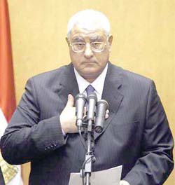 أدى المستشار عدلي منصور رئيس المحكمة الدستورية العليا اليمين القانونية امس الخميس رئيسا مؤقتا لمصر بعد أن أطاح الجيش بالرئيس محمد مرسي. وقال منصور في الكلمة التي ألقاها انه يعتزم اجراء انتخابات جديدة لكنه لم يحدد موعدا لها. وقبل اداء منصور اليمين بقليل حلقت طائرات عسكرية في سماء القاهرة ورسمت علم مصر بألوانه الاحمر والابيض والأسود. في غضون ذلك أصدر المستشار أحمد عز الدين بضبط وإحضار كل من المرشد العام لجماعة الإخوان المسلمين محمد بديع، ونائبه خيرت الشاطر، لاتهامهما بالتحريض على قتل المتظاهرين ، في ضوء ما كشفت عنه أقوال الشهود، في قضية مقتل 8 متظاهرين أمام مكتب الإرشاد بالمقطم، قبل أيام ، في إطار المظاهرات المناهضة للجماعة والرئيس المخلوع محمد مرسي.